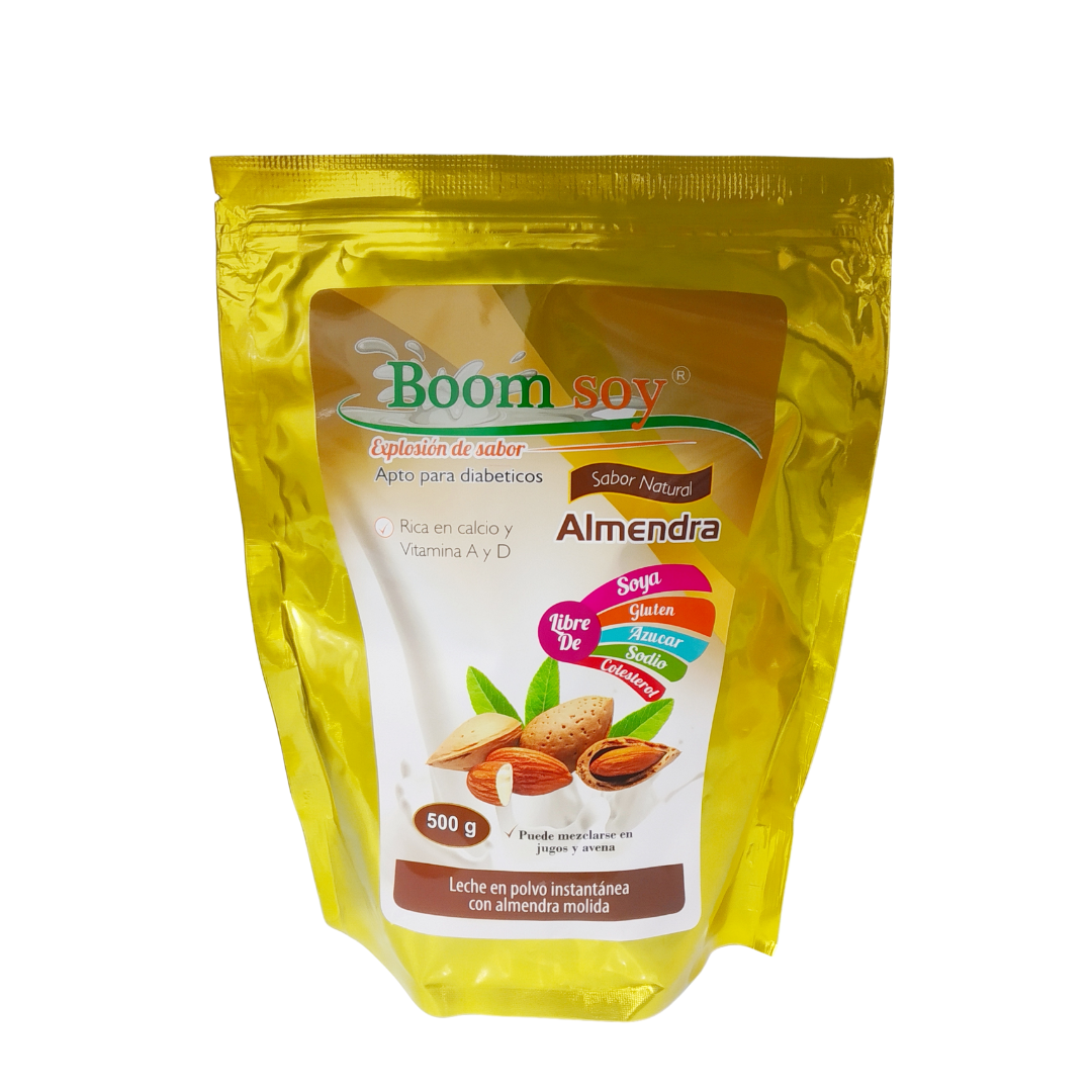 Leche en Polvo instantánea con Almendra Molida - Boom soy - Bolsa 250 / 500 gr La Leche en Polvo instantánea con Almendra Molida es una bebida apta para diabéticos, rica en calcio y Vitaminas A y D, además es un producto libre de Soya, Gluten, Azúcar, Sodio y Colesterol. Las Almendras son un antioxidante natural, controla los niveles de colesterol y triglicéridos, protege el sistema cardiovascular. Por su alto contenido de calcio puede ayudar a disminuir el riesgo de osteoporosis y favorece el tránsito intestinal.