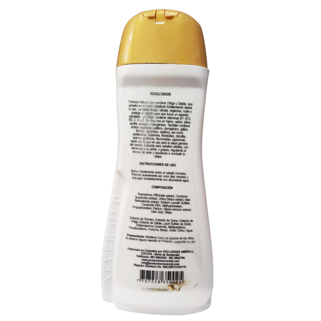 Champú Con Ortiga y Sábila - Never Old - Frasco 230 ml Formula natural que combina Ortiga y Sábila, que penetra en el cuero cabelludo fortaleciendo desde la raíz. La Sábila limpia, hidrata, regenera, nutre y protege el cabello para que luzca un aspecto saludable. La Ortiga contiene vitaminas B1, B12, B5, C, D y E. Es muy rica en hierro, calcio, silice, azufre, potasio, y manganeso, razón por la que se usa para la salud general del cabello, indicada para cabellos débiles, con tendencia a la caída, o grasos, regulando el exceso de sebo y ayudando a combatir la caspa.