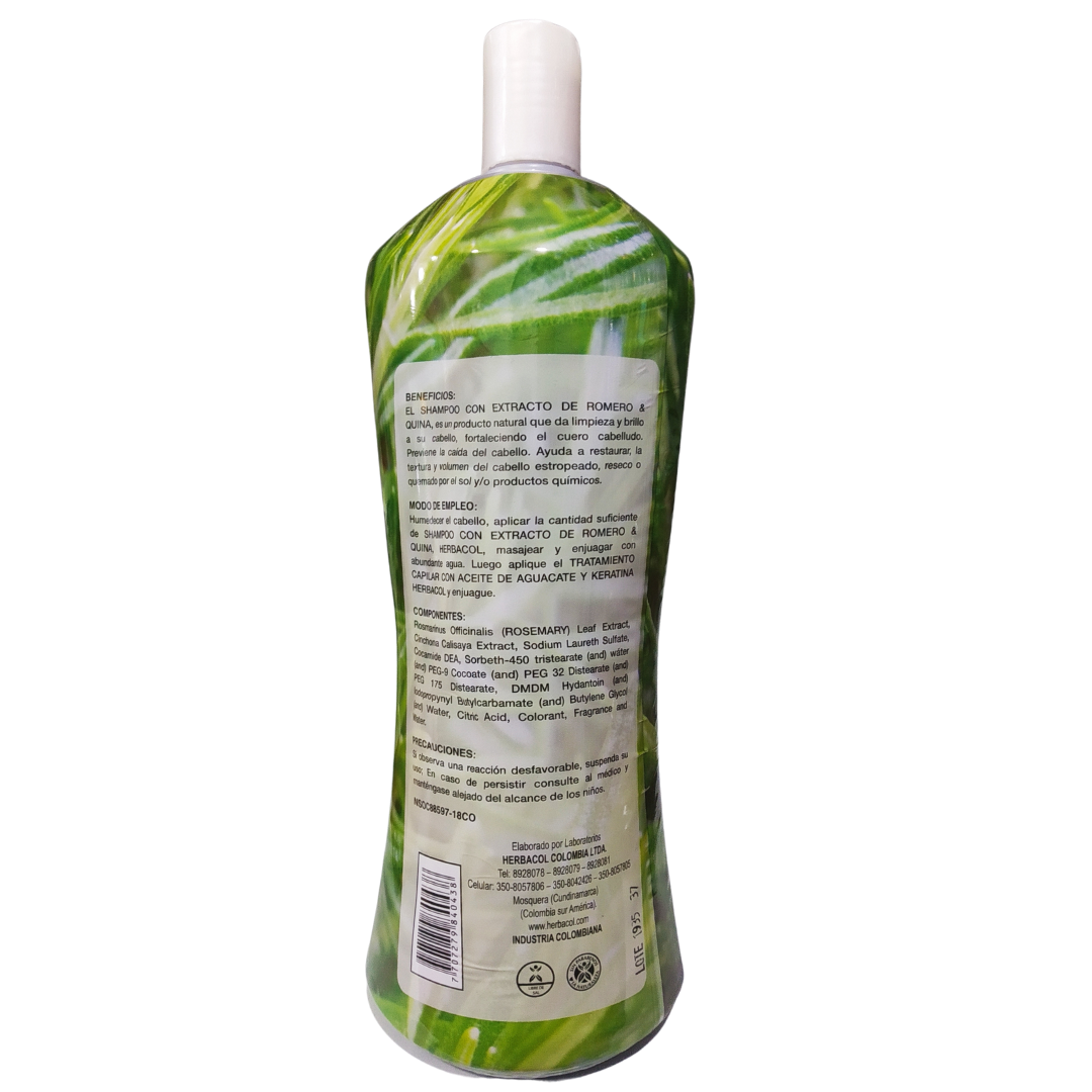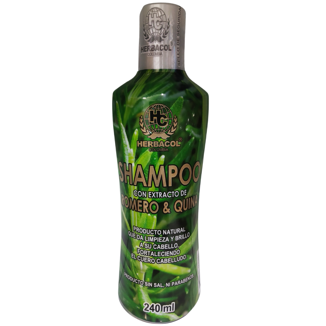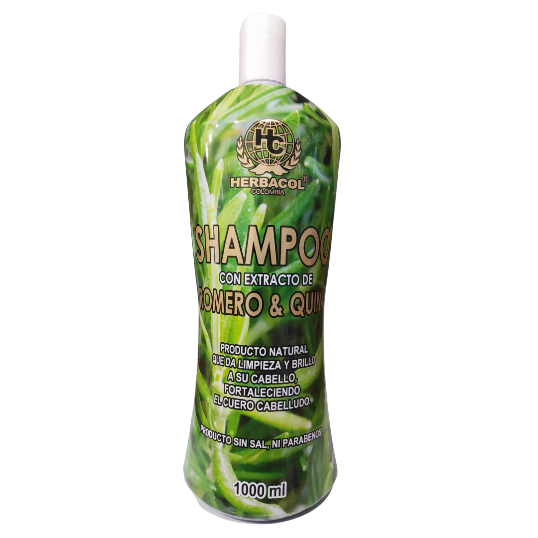 Shampoo Con Extracto de Romero y Quina - Herbacol - Frasco 240 / 1000 ml El Shampoo Con Extracto de Romero y Quina es un producto natural que da limpieza y brillo a su cabello, fortaleciendo el cuero cabelludo, previene la caída del cabello. Ayuda a restaurar la textura y volumen del cabello estropeado, reseco o quemado por el sol y/o productos químicos. Sin sal y sin parabenos.