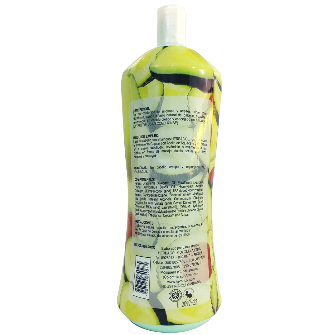 Tratamiento Capilar con Aceite de Aguacate y Keratina - Herbacol - Frasco 1000 ml El Tratamiento Capilar por su contenido de siliconas y aceites, sirve como hidratante y protector solar, especial para cabello seco y maltratado, ayuda al brillo natural del cabello, suaviza y desenreda.