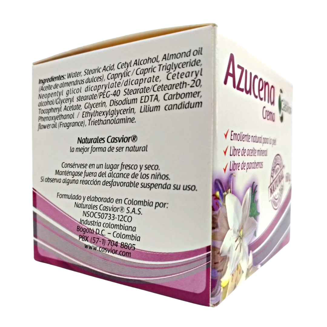 Crema Azucena - Casvior - Frasco 60 gr La crema humectante de Azucena enriquecida con aceite de almendras dulces y vitamina E, hidrata y protege la piel maltratada dejándola suave y saludable, la Azucena es conocida por sus propiedades para prevenir la aparición de manchas. Libre de aceite mineral, sin lanolina, sin parabenos.