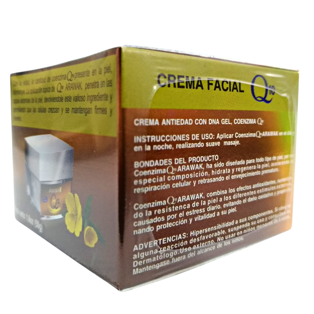 Crema Antiedad Con DNA Gel y Coenzima Q10 - Arawak - Frasco 50 gr La Crema Anti edad Coenzima Q10 ha sido diseñada para todo tipo de piel, por su especial composición, hidrata y regenera la piel, acelerando la respiración celular y retrasando el envejecimiento prematuro.