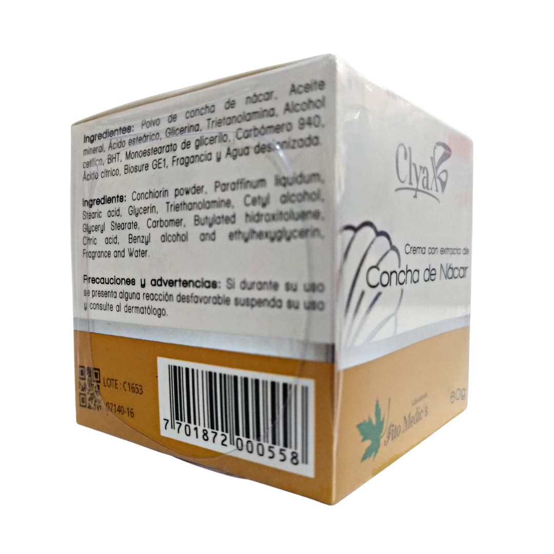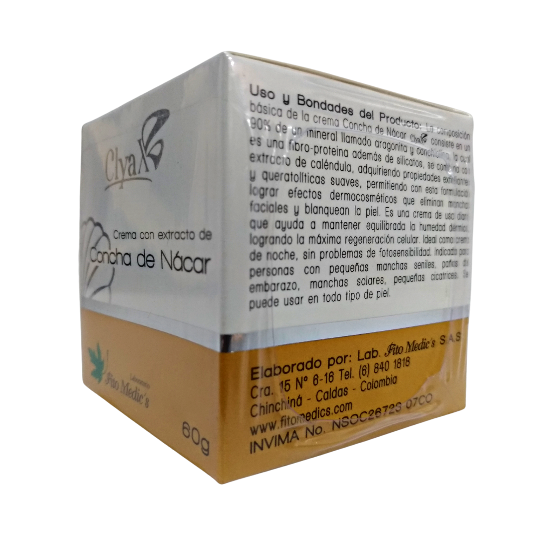 Crema Concha de Nácar - Fito Medic's - Frasco 60 gr La composición básica de la crema concha de nácar consiste en un 90% de un mineral llamado aragonita y conchiolina, la cual es una fibro-proteína además de silicatos, se combina con extracto de caléndula, adquiriendo propiedades exfoliantes y queratolíticas suaves, permitiendo con esta formulación lograr efectos dermocosméticos que eliminan manchas faciales y blanquean la piel.