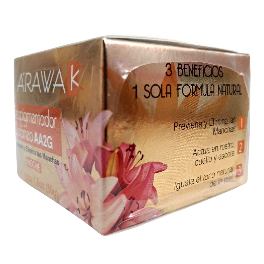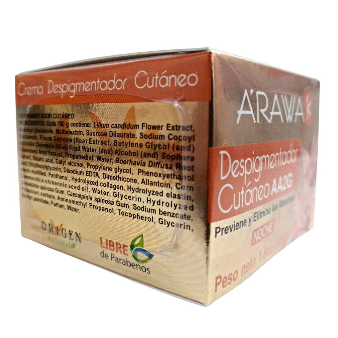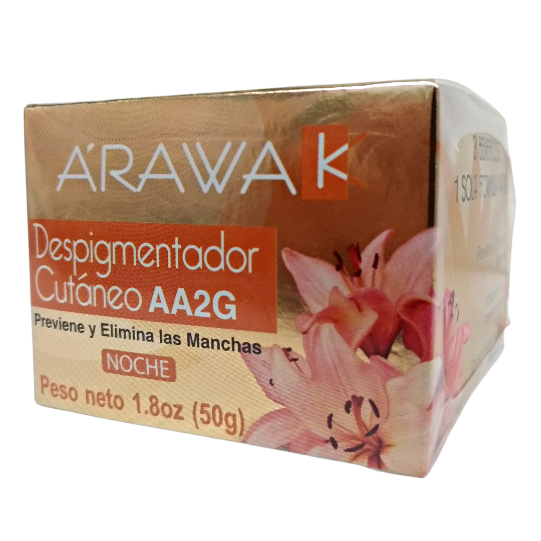Despigmentador Cutáneo AA2G - Arawak - Frasco 50 gr El Despigmentador Cutáneo AA2G, actúa sobre la piel disminuyendo y controlando la aparición de manchas oscuras causadas por hiperpigmentación. Sus componentes desmanchan la piel al mismo tiempo que le proporcionan una suave textura.