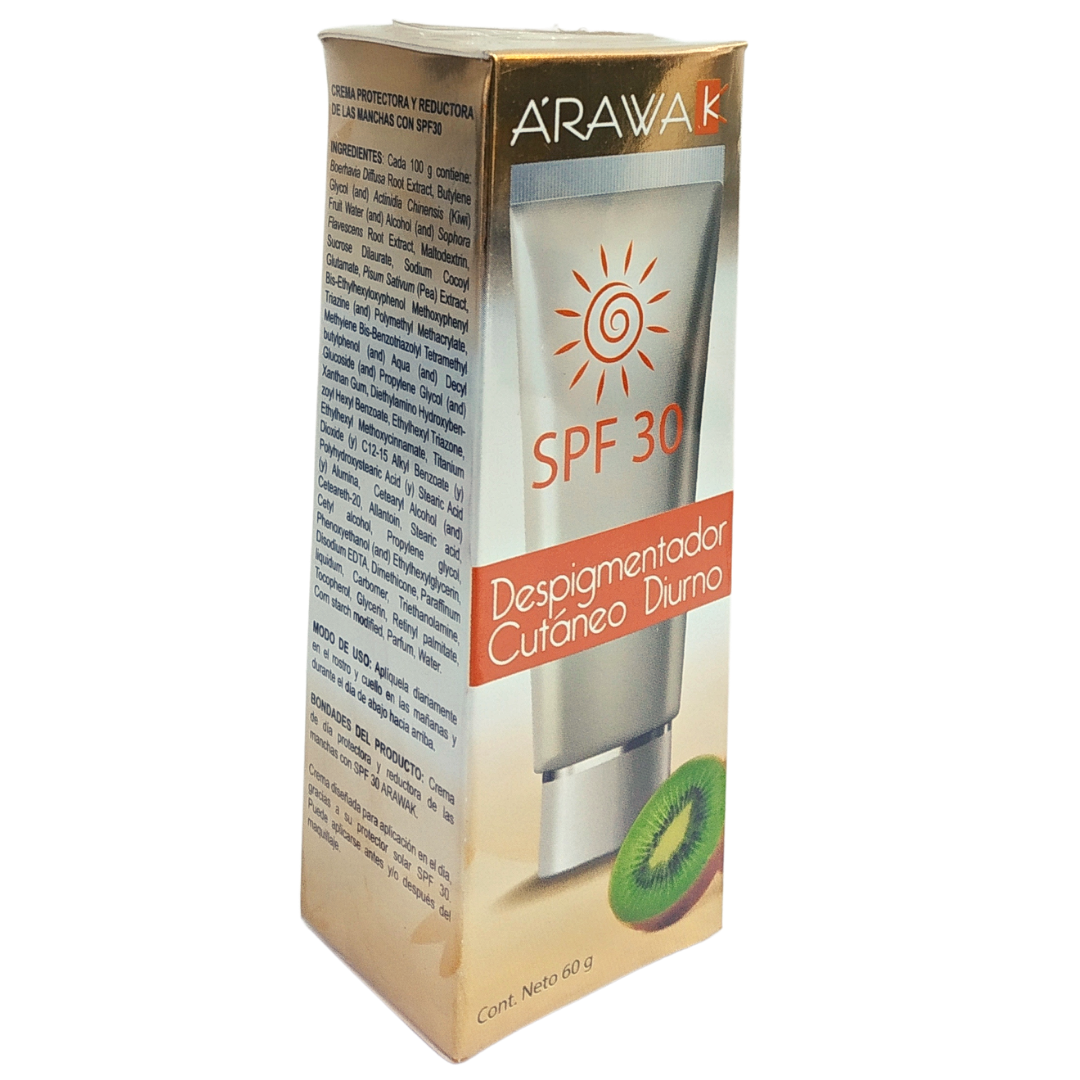 Despigmentador Cutáneo Diurno - Arawak - 60 g Crema protectora y reductora de las manchas con SPF 30 ARAWAK protege la piel del sol, luz artificial, viento, calor/frío y polución. Piel suave y joven por más tiempo. También reduce de manera efectiva la posibilidad de que aparezca hiperpigmentación, para lograr una piel más brillante y más uniforme.