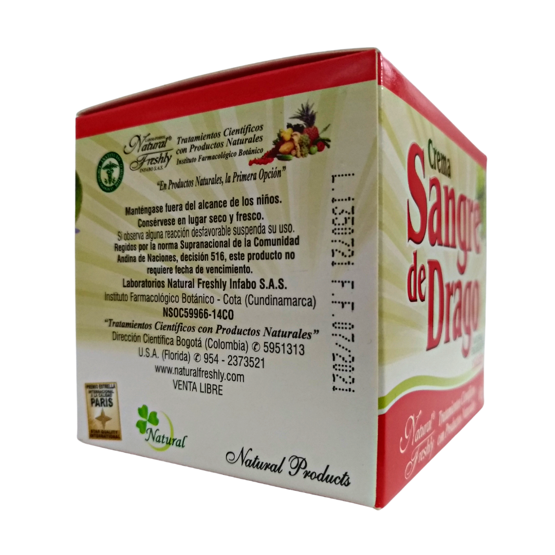 Crema Sangre De Drago- Natural Freshly - 60 gr La exclusiva formulación de la Sangre de Drago es ideal para regenerar naturalmente la piel. Sangre de Drago es un árbol que produce un látex rojizo de donde se extrae un raro alcaloide llamado ""taspina"", este látex es utilizado desde tiempos ancestrales en la medicina tradicional para las afecciones dérmicas, antiséptico y cicatrizante natural.