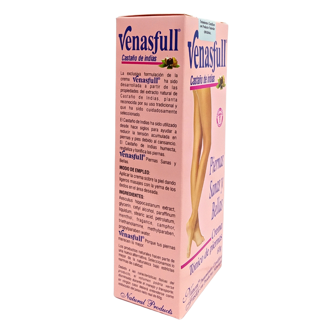 Venasfull Crema Castaño de Indias - Natural Freshly - Frasco 60 gr El castaño de indias ha sido utilizado desde hace siglos para ayuda a reducir la tensión acumulada en piernas y pies debido al cansancio. El castaño de indias humecta, revitaliza y tonifica las piernas.