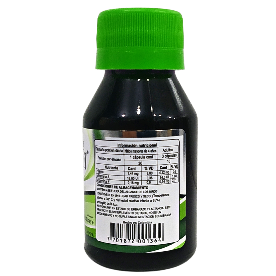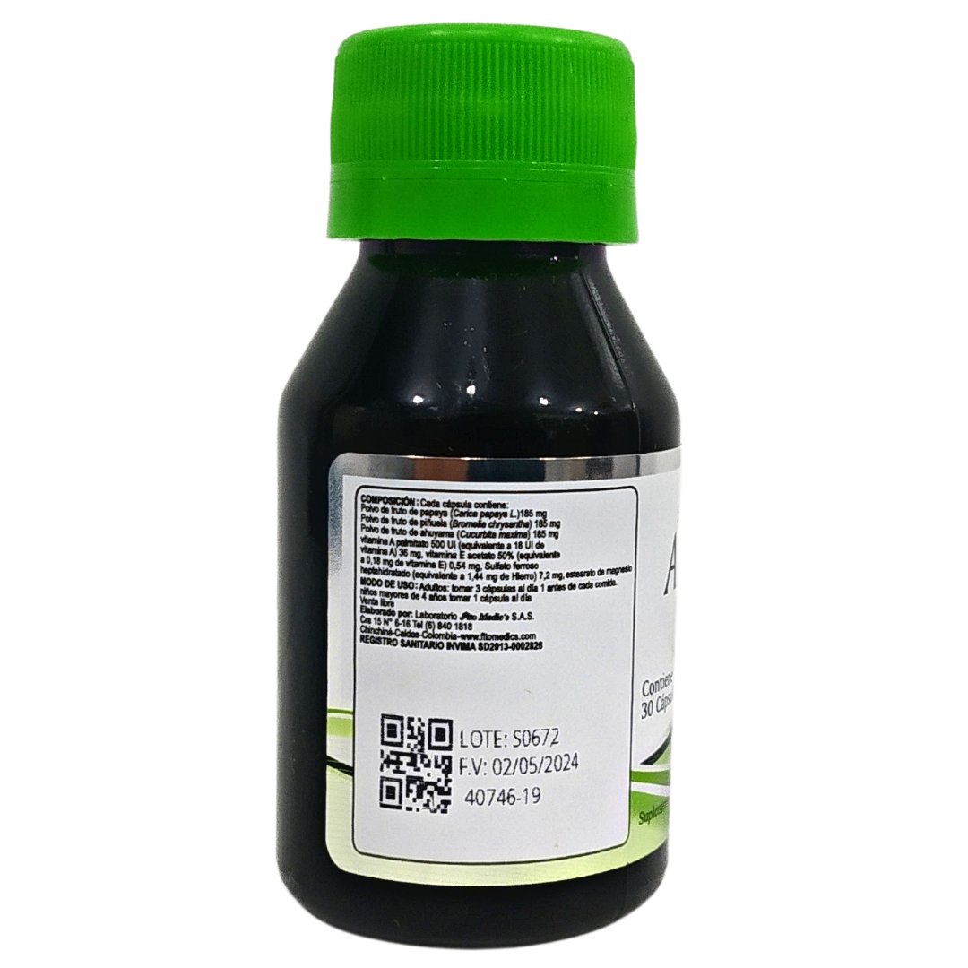 Componentes Polvo de fruto de papaya (Carica papaya L), 185 mg, Polvo de fruto de Piñuela (Bromelia chrysantha), 185 mg, Polvo de fruto de ahuyama (Cucurbita maxima), 185 mg, Vitamina A palmitato 500 UI (equivalente a 18 UI vitamina A), 36,0 mg, Vitamina E Acetato 50% (equivalente a 0,18 mg de vitamina E), 0,54 mg, Sulfato ferroso heptahidratado (Equivalente a 1,44 mg de Fe), 7,2 mg
