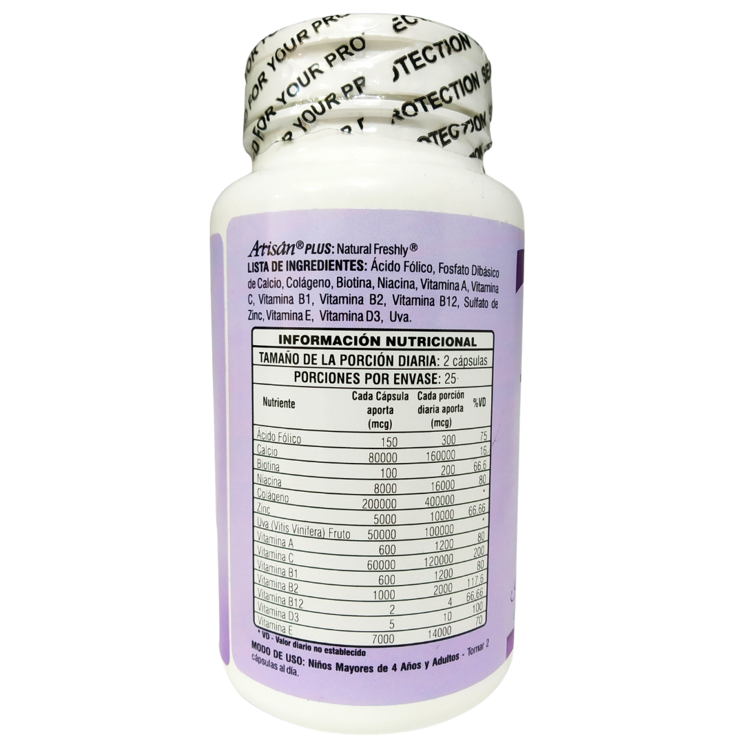 Componentes Ácido Fólico, Fosfato Dibásico de Calcio, Colágeno, Biotina, Niacina, Vitamina A, Vitamina C, Vitamina B1, Vitamina B2, Vitamina B12, Sulfato de Zinc, Vitamina E, Vitamina D3, Uva.