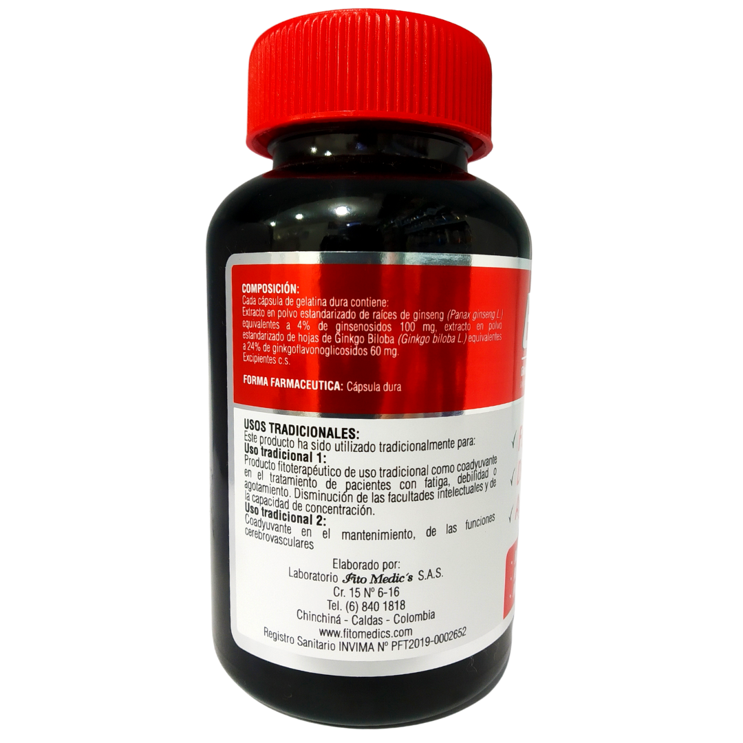 Componentes Cada cápsula de gelatina dura contiene: Extracto en polvo estandarizado de raíces de Ginseng equivalente a 4% de ginsenosidos 100 mg, extracto en polvo estandarizado de hojas de Ginkgo Biloba equivalentes a 24% de ginkgoflavonoglicosidos 60 mg. Excipientes c.s.