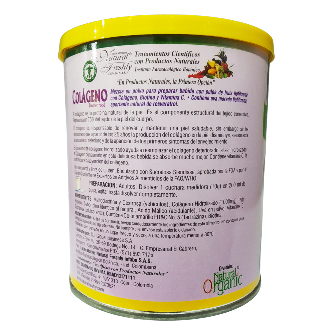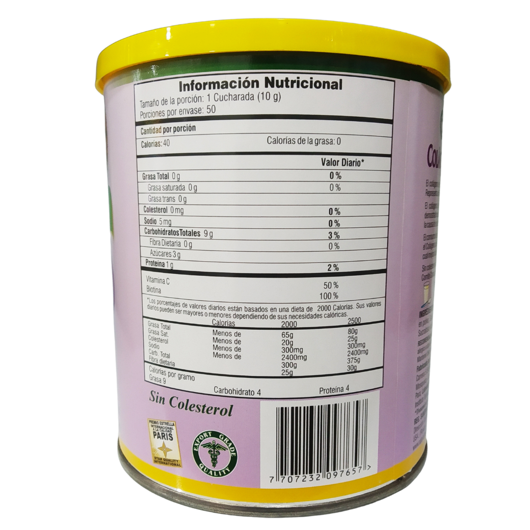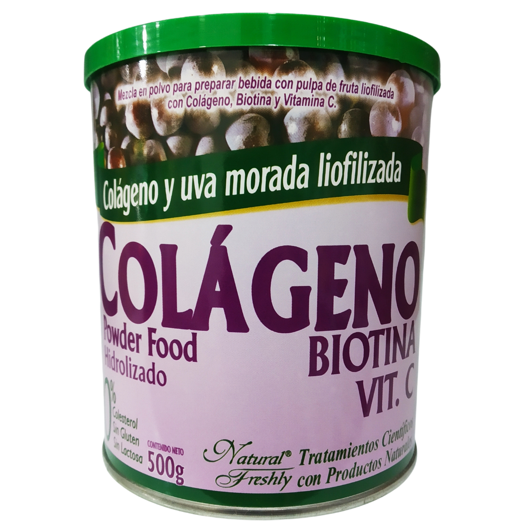 Componentes Contiene vitamina C, la cual mejora la absorción del Colágeno, Biotina, Maltodextrina, Colágeno Hidrolizado, Acido Málico, Uva Liofilizada, sabor uva (idéntico al natural). 0% Colesterol. Sin Lactosa, Libre de Gluten. Ver el detalle de los ingredientes al respaldo del tarro.