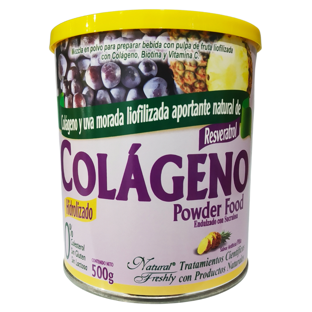 Colágeno Hidrolizado Polvo - Natural Freshly - Tarro 500 g Con el paso de los años Ia cantidad de colágeno de los tejidos del cuerpo va disminuyendo y como consecuencia se presentan en el organismo señales inequívocas de la falta de colágeno y aparecen las líneas de expresión o llamadas también arrugas, pérdida de elasticidad del cabello, fragilidad en las uñas, aparición de manchas (lunares) en las manos y brazos, endurecimiento de los tejidos y las válvulas cardiacas, fragilidad de los discos intervertebrales y desgaste de meniscos. Además, el colágeno en polvo de Natural Freshly, provee una fuente natural de proteína de colágeno, para ayudar a mantener la salud de la piel y todos los tejidos del organismo.