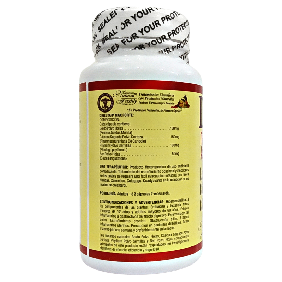 Digestar Max Forte - Natural freshly - Frasco x 50 Capsulas Producto Fito terapéutico de uso tradicional como laxante, tratamiento ocasional y afecciones en las cuales se requiera una fácil evacuación intestinal con heces blandas. Colerético y colagogo. Coadyuvante en la reducción de los niveles de colesterol.