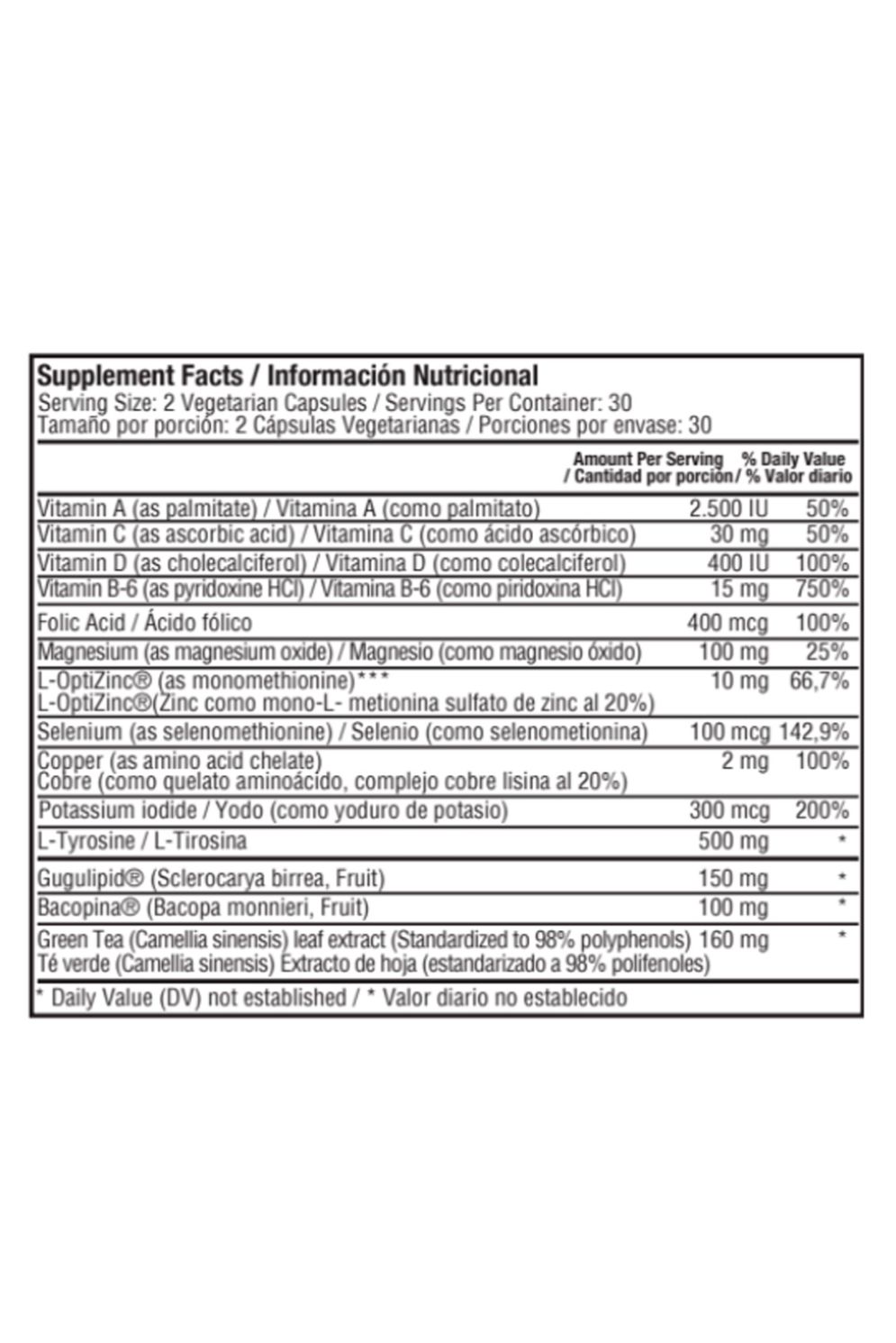 Componentes Optizinc® zinc (como mono-l-metionina sulfato de zinc al 10%) (Mineral), Gugulipid® (sclerocarya birrea, fruit) (vegetal), Bacopin® (bacopa monnieri, fruit) (vegetal), Yodo (como yoduro de Potasio) (mineral), L-tirosina (aminoácido). Secundarios: Selenio (como selenometionina) (mineral), Cobre (como quelato aminoácido, complejo cobre lisina) (mineral), Vitamina A (como palmitato) (vitamina), Vitamina C (como ácido ascórbico) (vitamina), Vitamina D (como colecalciferol) (vitamina), Vitamina B6 (como piridoxina HCl) (vitamina), Ácido fólico (vitamina), Magnesio (como óxido de magnesio) (mineral), Té verde (camellia sinensis) extracto de hoja (vegetal).