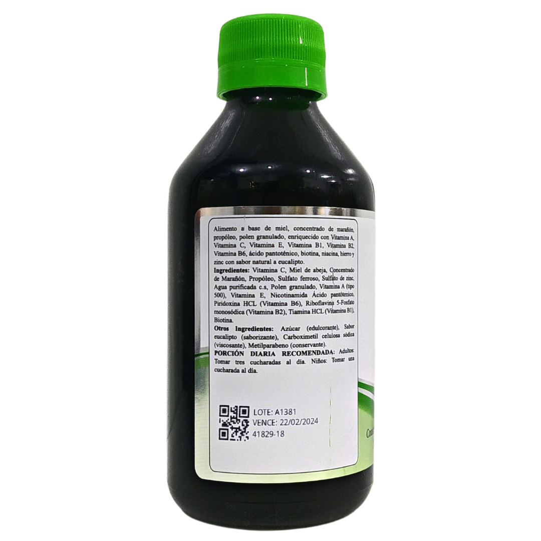 Componentes Jalea a base de miel, concentrado de Marañón, concentrado de fruto de Totumo, propóleo, polen granulado, vitamina A, C, B1, B2, B6, Acido Pantoténico, biotina, niacina, hierro y zinc. Con sabor natural a Eucalipto.