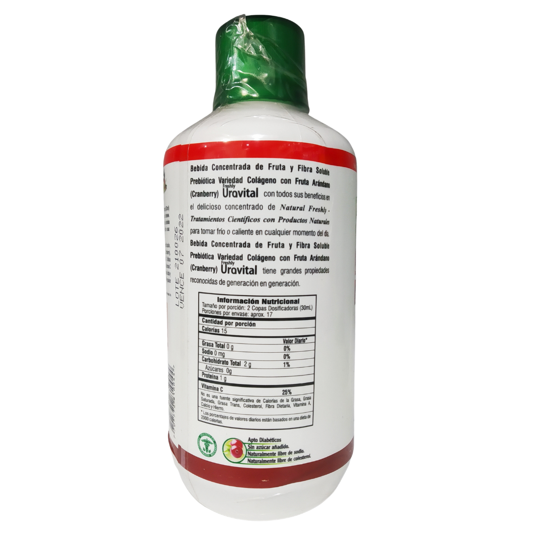 Urovital Bebida Concentrada - Natural Freshly - Botella 500 ml Bebida concentrada de fruta y fibra soluble prebiótica variedad colágeno con fruta de arándano. El arándano rojo, también conocido por su nombre en inglés Cranberry, es una fruta que posee varias propiedades medicinales y es utilizada, principalmente, para prevenir infecciones urinarias recurrentes, pues logra impedir el desarrollo de bacterias en el tracto urinario.