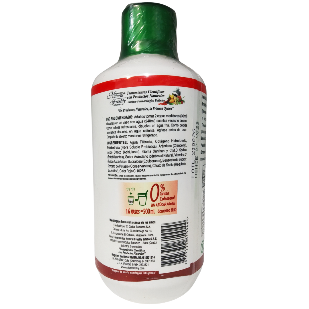 Componentes  Agua filtrada, Colágeno hidrolizado, Polidextrosa, Arándano, Ácido cítrico, Goma Xanthan y C.M.C Sódica, Vitamina C, Sucralosa, Benzoato de sodio y Sorbato de potasio, Citrato de sodio. Sin azúcar añadido.