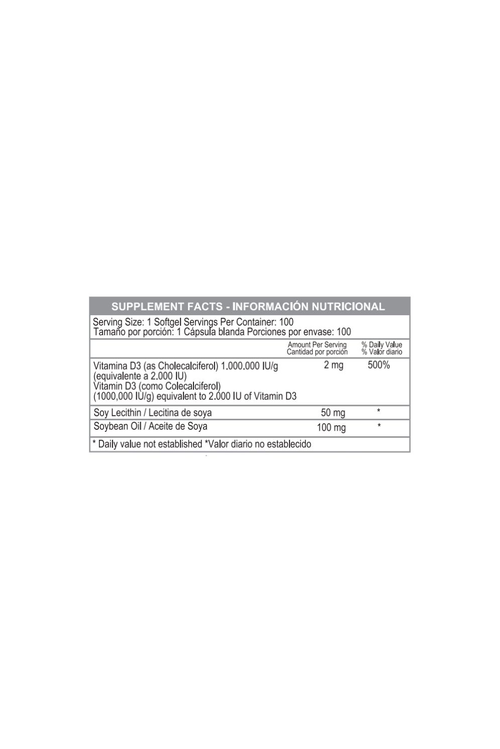 Componentes Vitamina D3 (vitamina) Lecitina de soya (vegetal), Aceite de soya (vegetal).