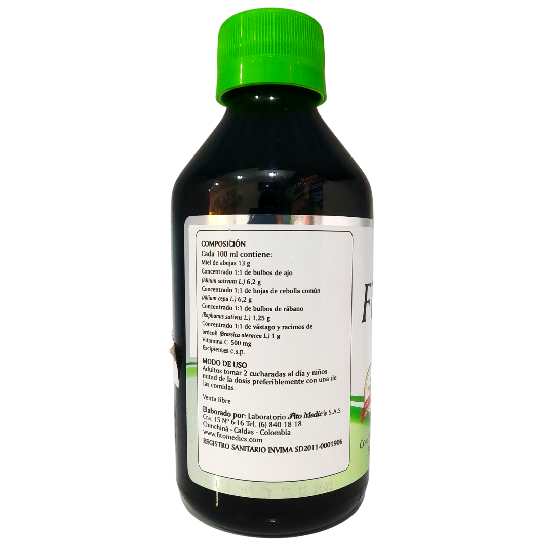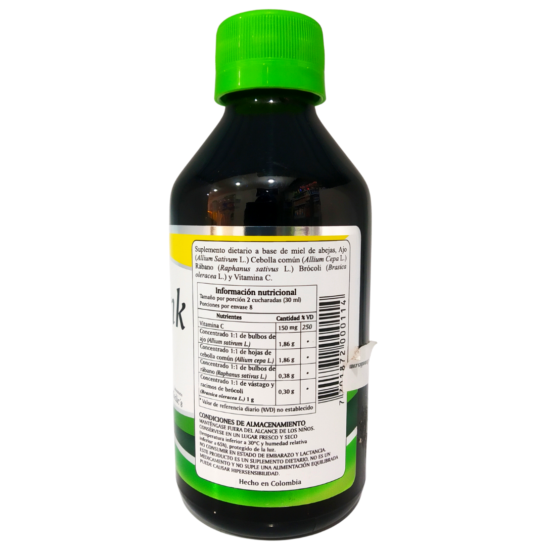 Componentes Miel de abejas, Concentrado 1:1 de bulbos de ajo, Concentrado de hojas de cebolla común, Concentrado 1:1 de bulbos de rábano, Concentrado 1:1 de vástago y racimos de brócoli, Vitamina C 500 mg.