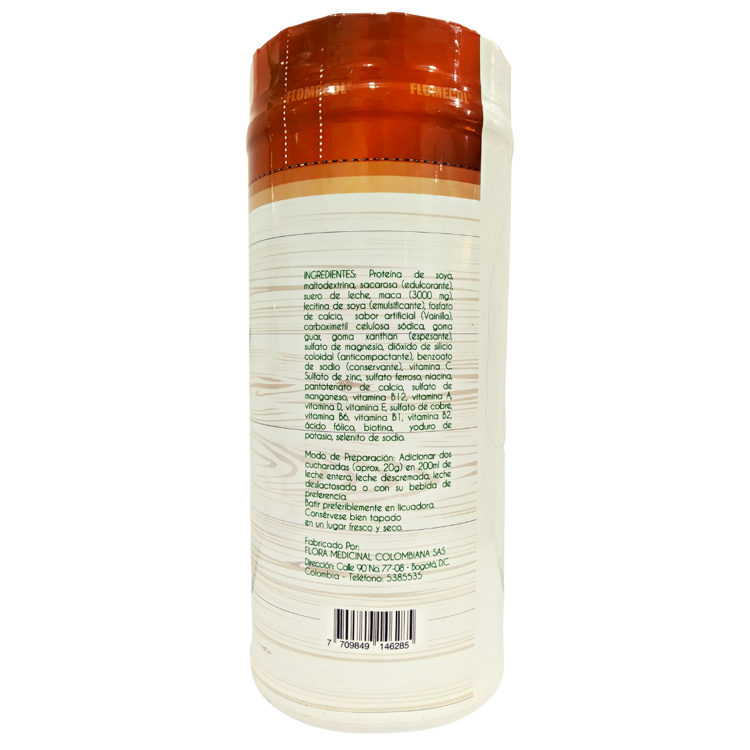 Componentes Niacina, Calcio, Zinc, Vitaminas A, B1, B6, B12, Proteína de soya, maltodextrina, sacarosa (edulcorante), suero de leche, Maca (3000 mg), lecitina de soya (emulsificante), fosfato de calcio, sabor artificial (vainilla), ver el detalle en el respaldo del frasco.