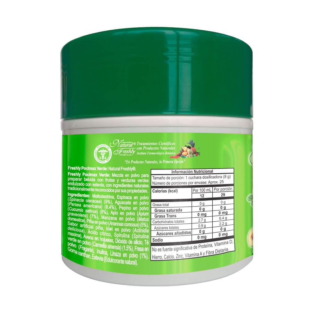 Pocimax Verde - Natural Freshly - Tarro 200 gr Mezcla en polvo para preparar bebida con frutas y verduras verdes endulzado con estevia, con ingredientes naturales tradicionalmente reconocidos por sus propiedades. Libre de Gluten. Frío o Caliente.